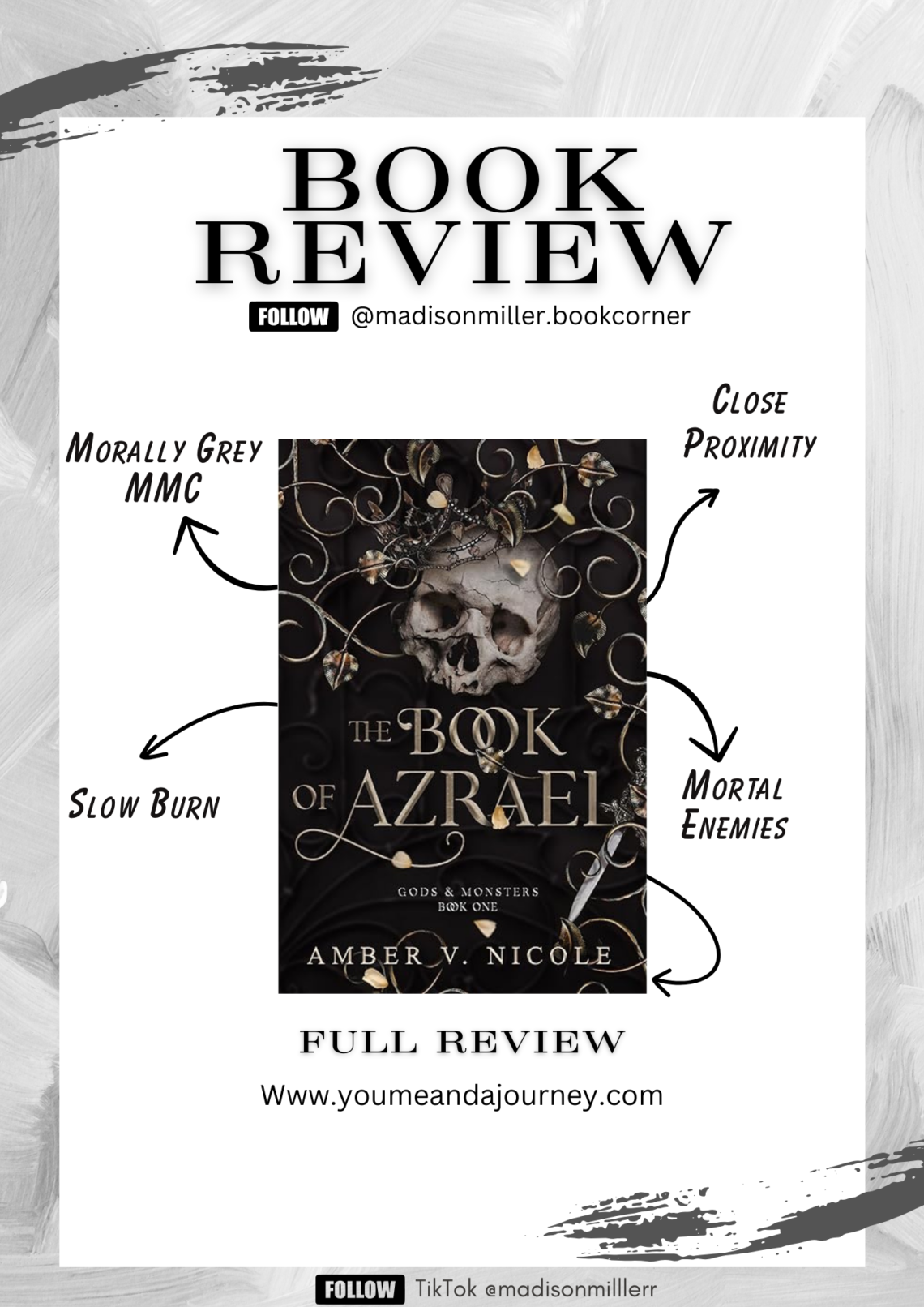 Title: The Book of Azrael Author: Amber V. Nicole Published: March 29th, 2022 Publishing House: Rose & Star Publishing Series: Gods & Monsters Rating: ⭐️⭐️⭐️⭐️⭐️ Hello my fellow fantasy lovers, today we are diving into Amber V. Nicole’s “The Book of Azrael”. The Book Of Azrael is a captivating journey that begins in the deserts of Eoria with Dianna’s sacrifice to save her dying sister. Little did she expect that her plea would be answered by a monster far worse than any nightmare, setting the stage for an epic tale of adventure, intrigue, self reflection and complex relationships. From the very first chapter, I knew this would be a five…